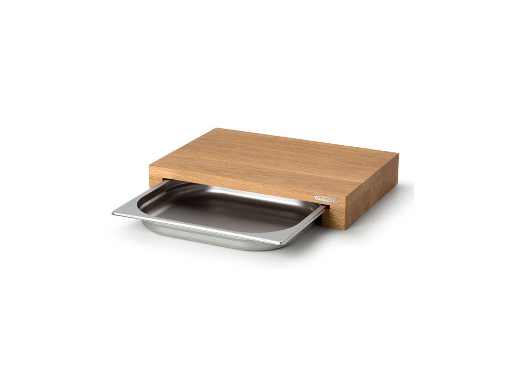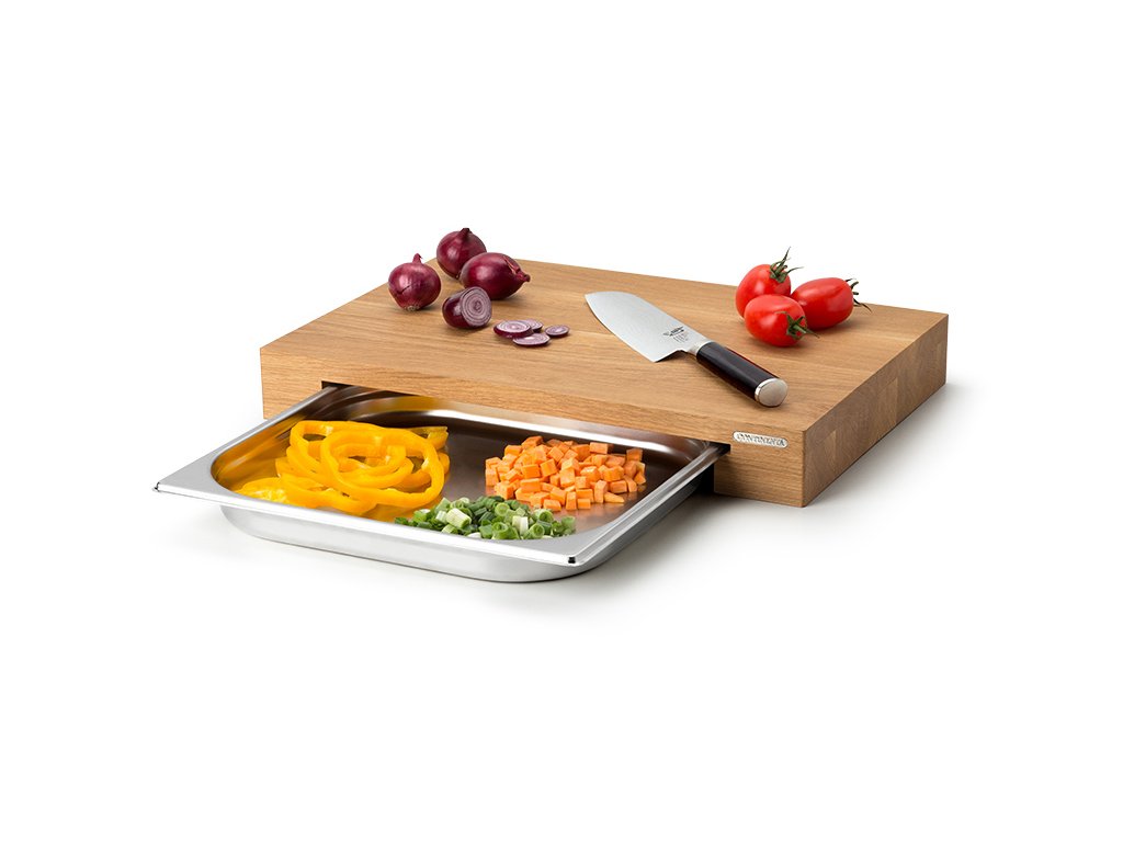 Nabízíme Vám krájecí desku z kvalitního dubového tvrdého dřeva s nerezovou zásuvkou s propracovaným nadčasovým designem a integrovaným kovovým logem. Jedná se o 100% přírodní dřevo - dub. Nerezovou zásuvku k vysunutí z obou stran lze použít také jako pečící plech.