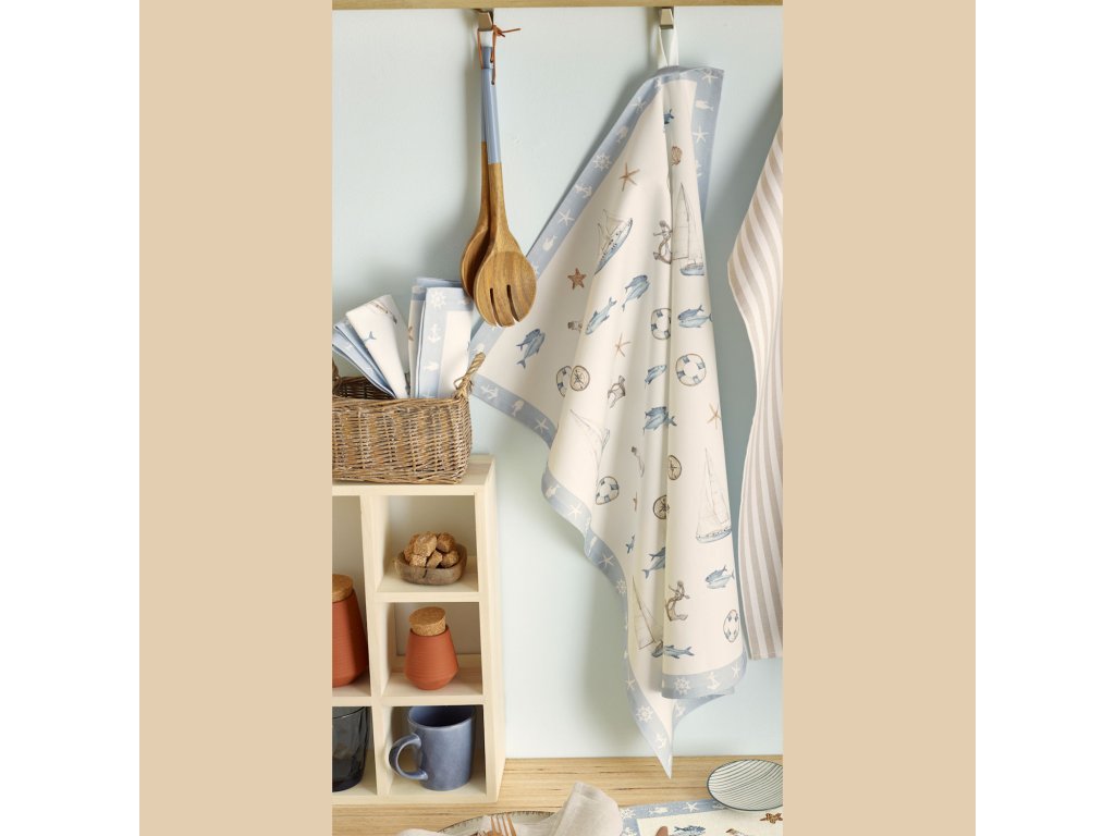Nabízíme Vám textilní utěrku v modro-bílo-béžové kombinaci s letním námořnickým vzorem o rozměru 50x70cm. Stane se nepostradatelným pomocníkem v kuchyni i během servírování oběda či večeře. Každý si zde najde svůj oblíbený motiv věcí, které jsou na moři, v moři nebo na moři, lodě, plachetnice, kotvy, ryby, mušle nebo vzkaz v láhvi. Skvěle se kombinuje s pruhovanými utěrkami Adam v modré, béžové nebo šedé barvě. Pokud ovšem preferiujete čistě mořský styl, může doplnit o kolekci Sailor.