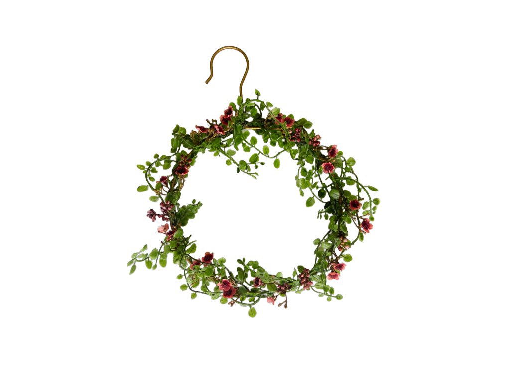 Nabízíme Vám krásnou originální umělou květinovo-listovou, kde se propojují drobné kvítky Gypsophily jarní v růžové barvě s jarními zelenými lístky Foliage. Upěvněno je vše na kovovém kruhu s ramínkovými zakončením pro pohodlné zavěšení.