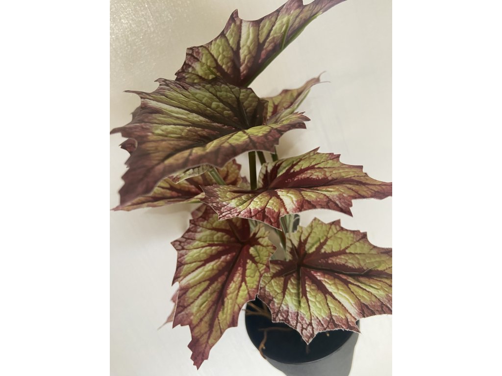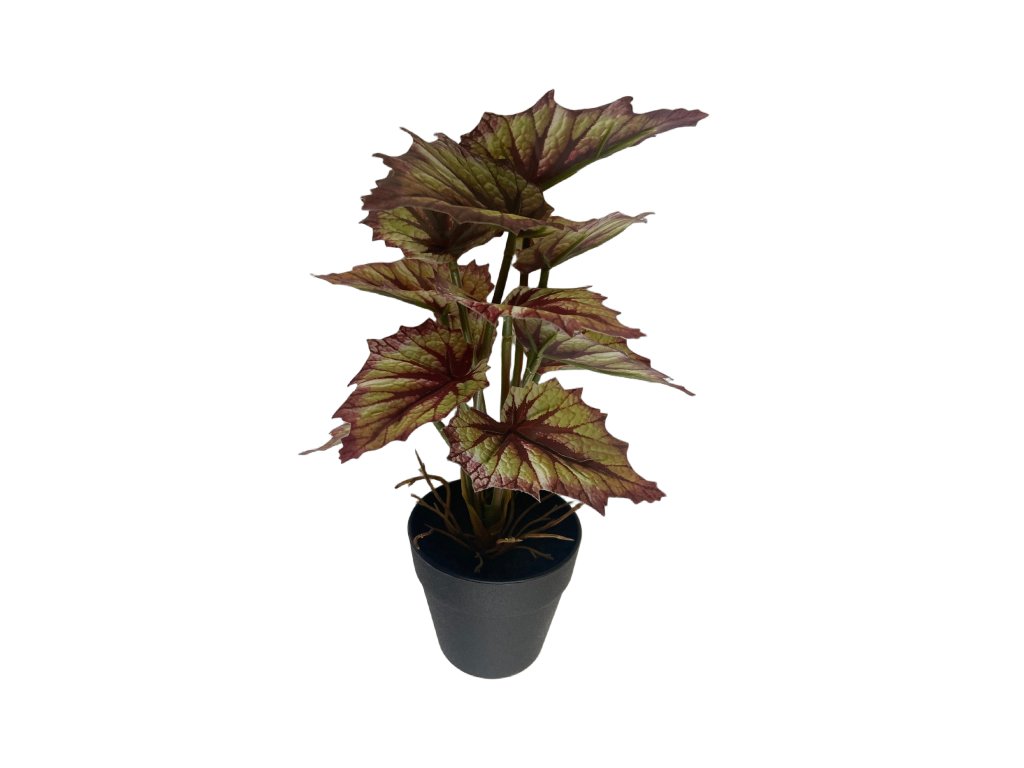 Nabízíme Vám umělou dekoraci Begonie Rex v zeleno-burgundy barvě v černém květináči jako celoroční výzdobu.