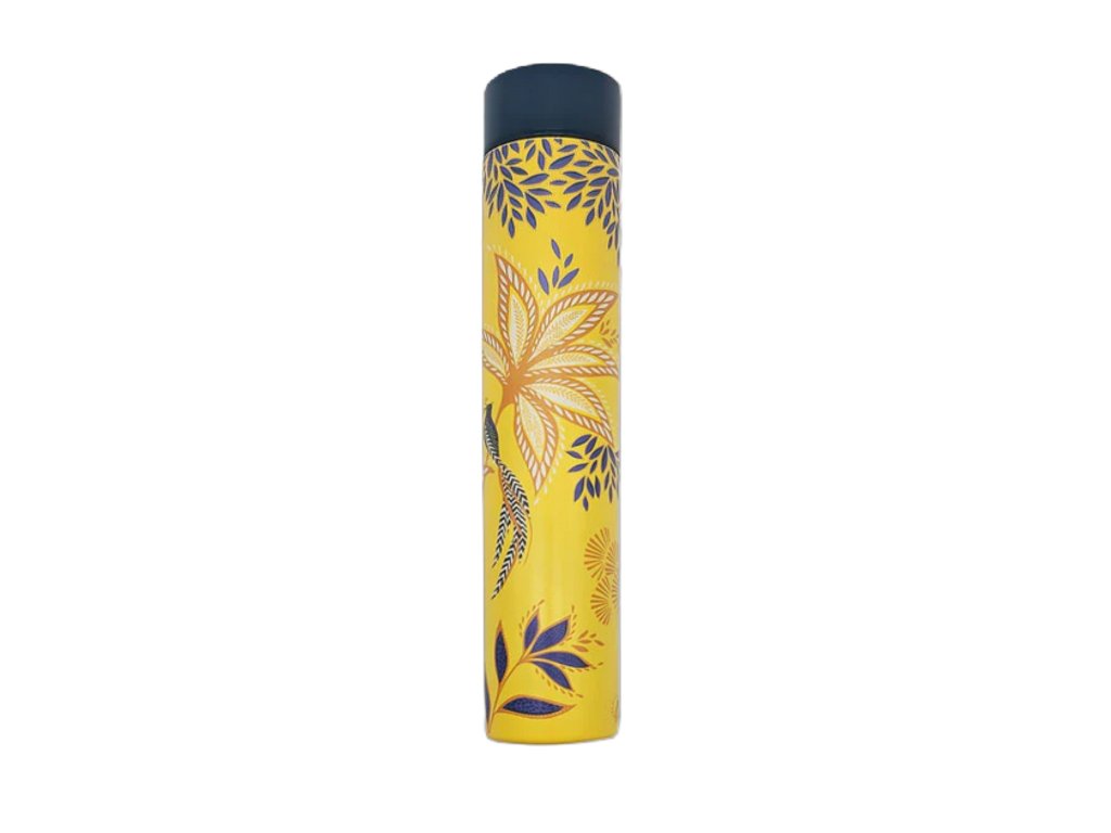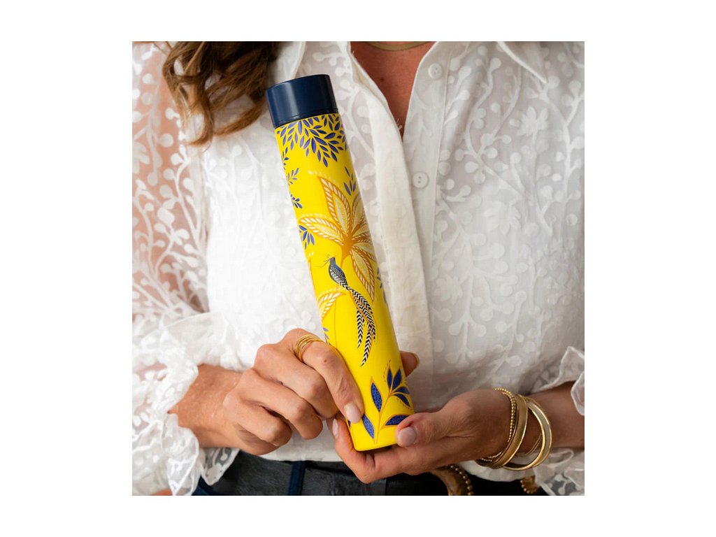 Nabízíme Vám designovou SLIM (tenkou) láhev na vodu Birds & Bloom ve žluté barvě s temně modrým šroubovacím víčkem, která kombinuje každodenní praktičnost s elegantním designem. Půvabné siluety ptáků sedí mezi vrstvami bujných květů na bohatém, povznášejícím žlutém pozadí, zakončené jemnými zlatými detaily pro luxusní nádech. Její tenký a lehký tvar je dokonale navržen tak, aby se vešla do kabelky, a proto je ideální pro dny ve městě, dojíždění nebo hydrataci na cestách. Vyrobena z odolného nerezu s izolačními vlastnostmi. Udrží vaše nápoje v perfektní teplotě a zároveň dodává sofistikovaný nádech vašemu každodennímu režimu.