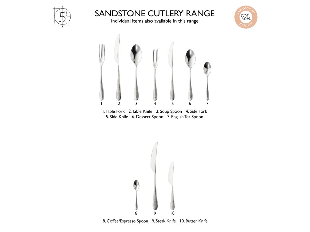V této kolekci nabízíme jak jednotlivé kusy příborů s možností zakoupení jednotlivě, tak i set Sandstone set 24ks nebo set 42ks příborů v sadě. Jednotlivé kusy příborů lze také dokoupit takto: Sandstone na hlavní chod či Sandstone velká servírovací na překládání salátů apod, nebo klasická moučníková vidlička řezačka. Lžíce nabízíme Sandstone klasickou polévkovou, lžičku kávovou i čajovou. A vše doplněno velkou servírovací lžíci k servírovací vidličce. Samozřejmě nechybí Sandstone dlouhá lžička na kávu Latte Macchiatto. Nože jsou samostatně k dispozici Sandstone nůž na hlavní chod, nůž na steak nebo nůž na máslo.