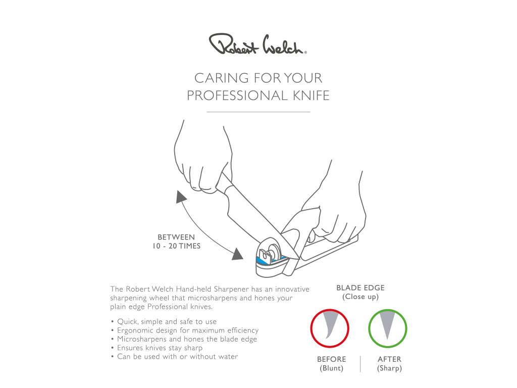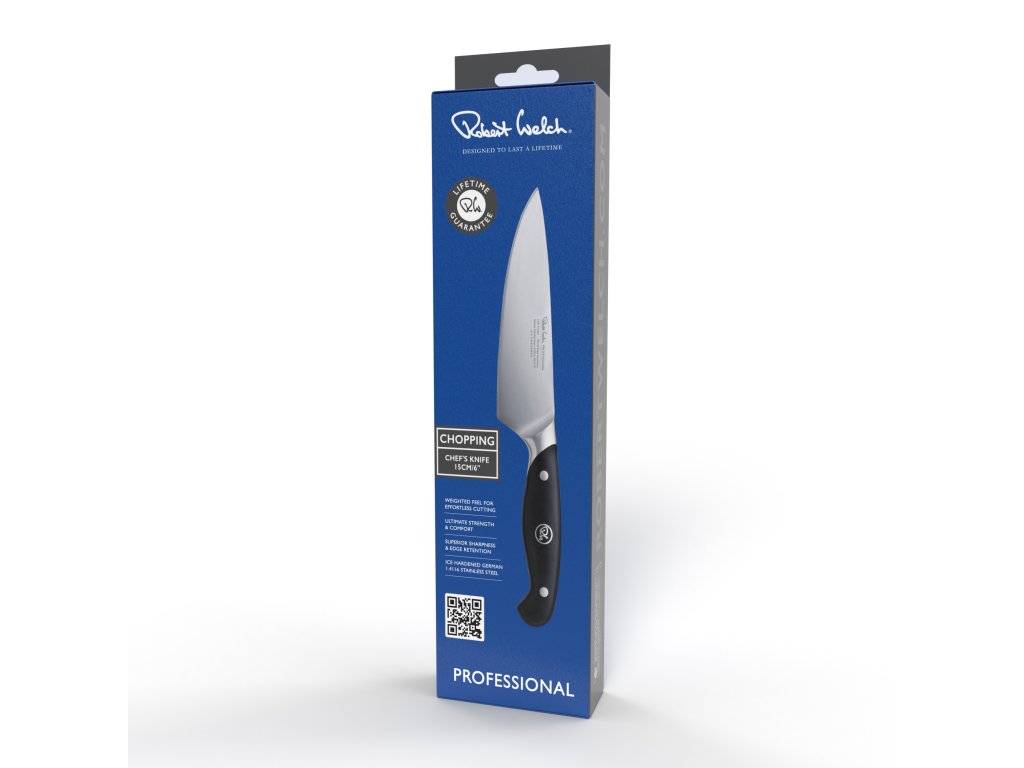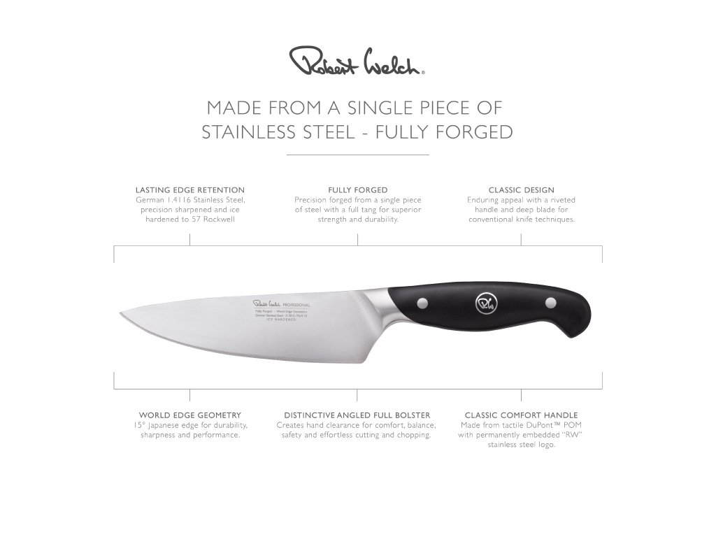 I tato řady kuchyňských nožů Robert Welch Professional Chef´s byla navržena ve spolupráci s profesionálními kuchaři, čemuž předcházely roky výzkumu, tvorby designu a testování. Jsou plně vykovány z vysoce kvalitní německé (DIN 1,4116) nerezové oceli a to z jednoho kusu pro dodatečnou sílu. Ostří nožů v japonském stylu jsou ručně aplikované na úhel 15°. Rukojeti jsou vyrobeny z matného DuPont™ materiálu a jsou ergonomicky tvarované pro maximální pohodlí a vyváženost.
