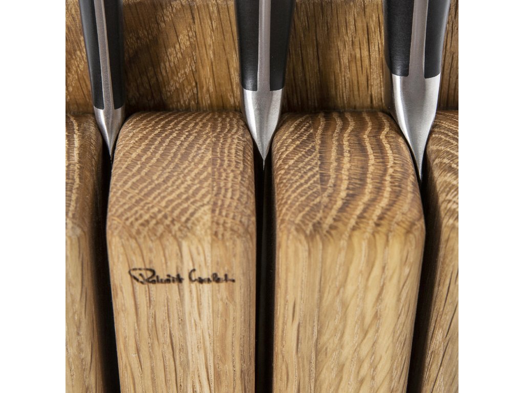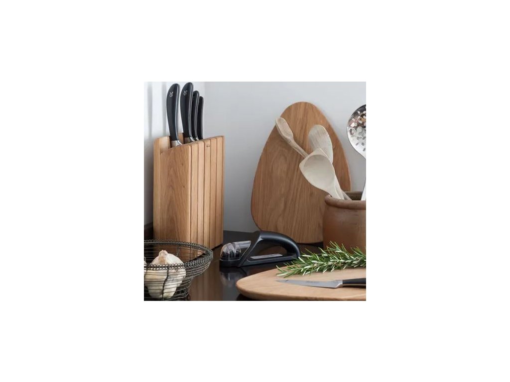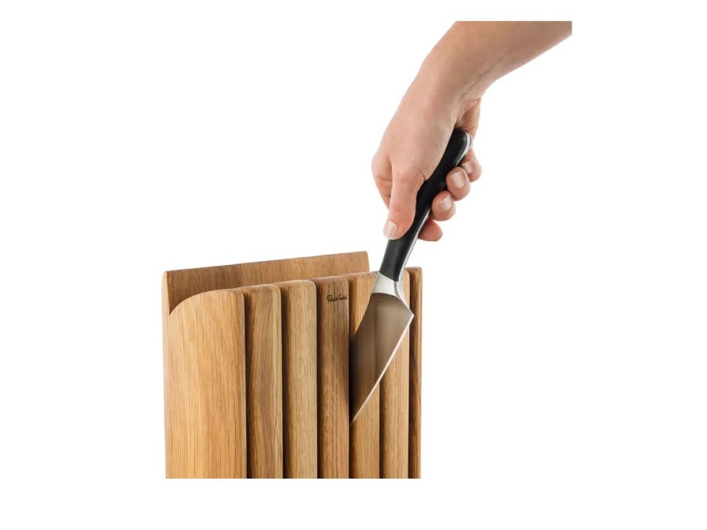 Nabízíme Vám špičkový designový set stojanu Book Oak se 6-ti noži z několikanásobně oceněné řady nožů Signature. Svislá pozice uložení nožů ve stojanu je velmi praktická - nože jsou vždy při ruce. Stojan je efektivním řešením pro úsporu místa v kuchyni. Ideální pro umístění ke stěně nebo na stranu kuchyňské pracovní plochy. Vyroben z pevného dubového dřeva, na spodní části jsou silikonové nohy.
