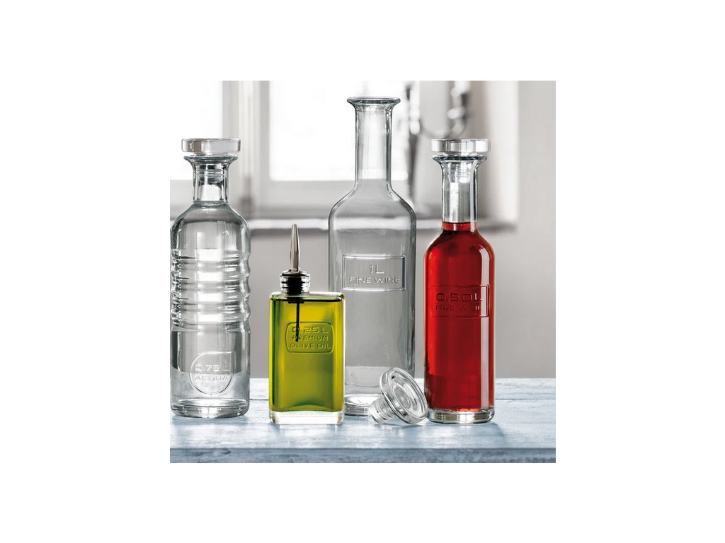 Nabízíme Vám populární malou skleněnou láhev na olej s nerezovou nálevkou (18/8) se silikonovým těsněním od špičkového italského výrobce Luigi Bormioli z kolekce OPTIMA, která se vyznačuje silným a pevným sklem odolným proti rozbití.