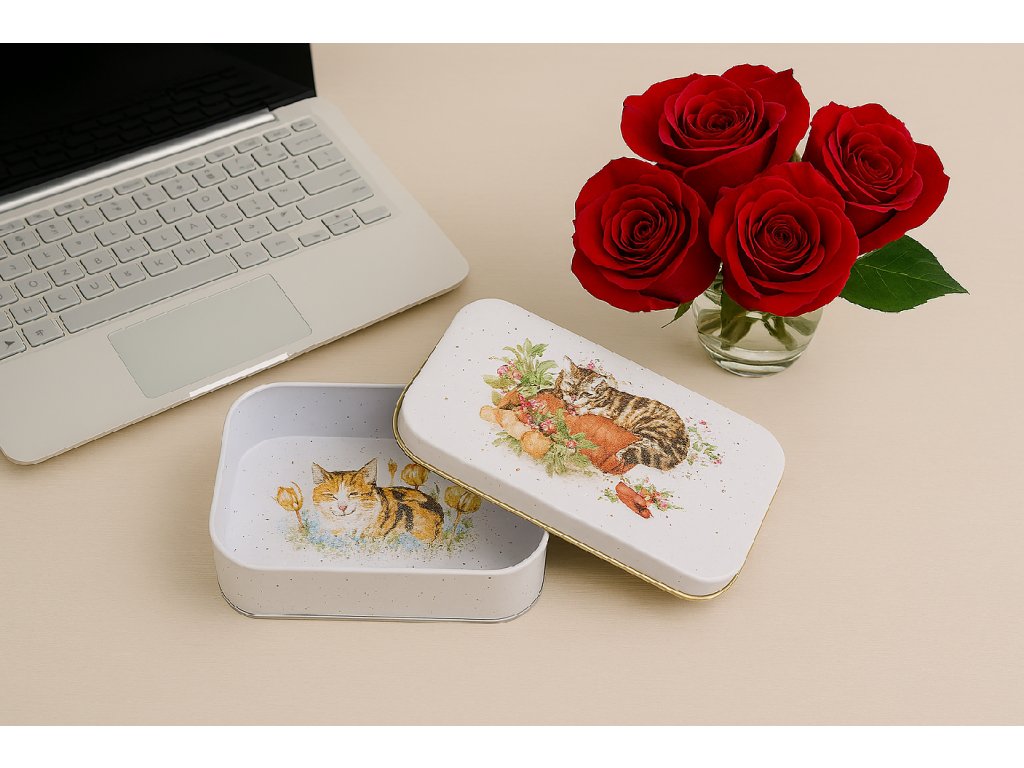 Nabízíme Vám krásnou mini plechovou dózu na drobnosti s motivem kočiček ve Wrendale designu ,,Puffffect Birthday,,. Dóza je vhodná k uchovávání menších bonbónů, žvýkaček, dražé, pilulek či jiných drobností. Využití najde nejen v kuchyni, ale třeba také v kanceláři nebo v dětském pokoji. Pro svou velikost je vhodná také do dámské kabelky.