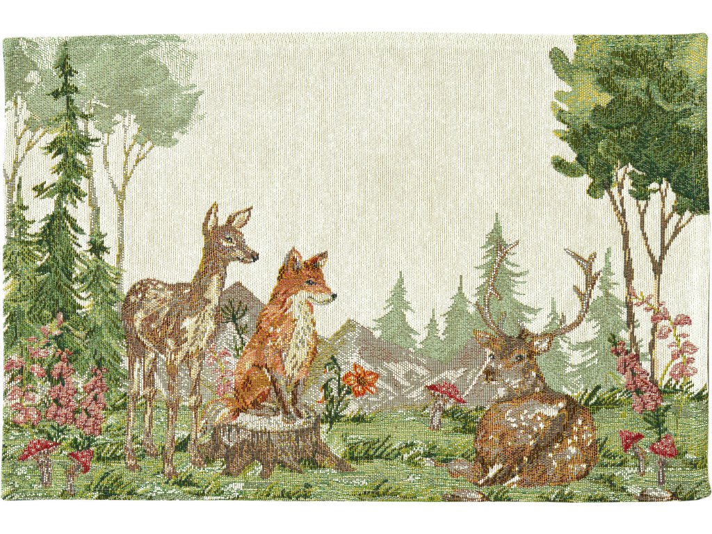 Vneste do svého stolování nádech umělecké tradice s naším středovým pásem Sander Huron s motivem jelena, srnců a lišky, kteří se shromáždili na lesní mýtině mezi roztomilými muchomůrkami a náprstníky s pozadím hor a jedlí. Precizně tkané z kvalitních materiálů s bohatými vzory inspirovanými klasickými motivy. Tento typ pásu kombinuje estetiku s praktičností. Je ideální volbou pro slavnostní chvíle i každodenní použití.