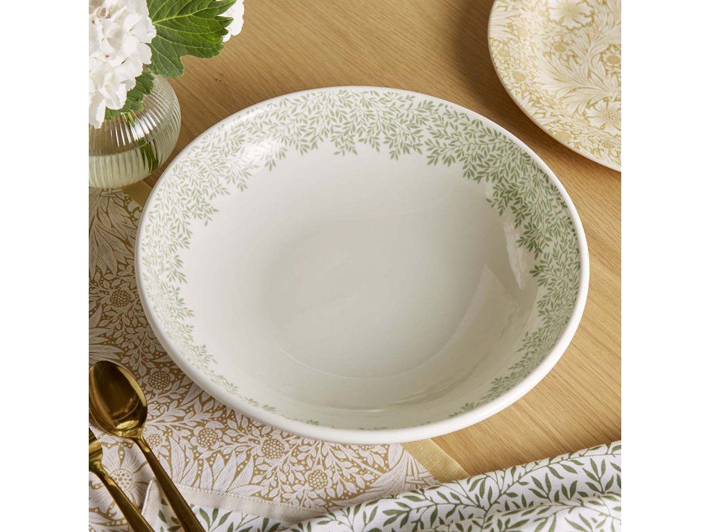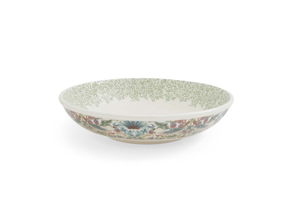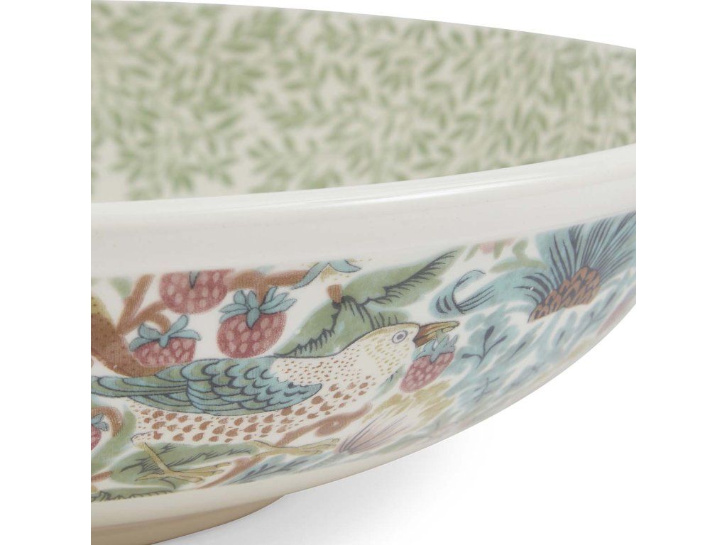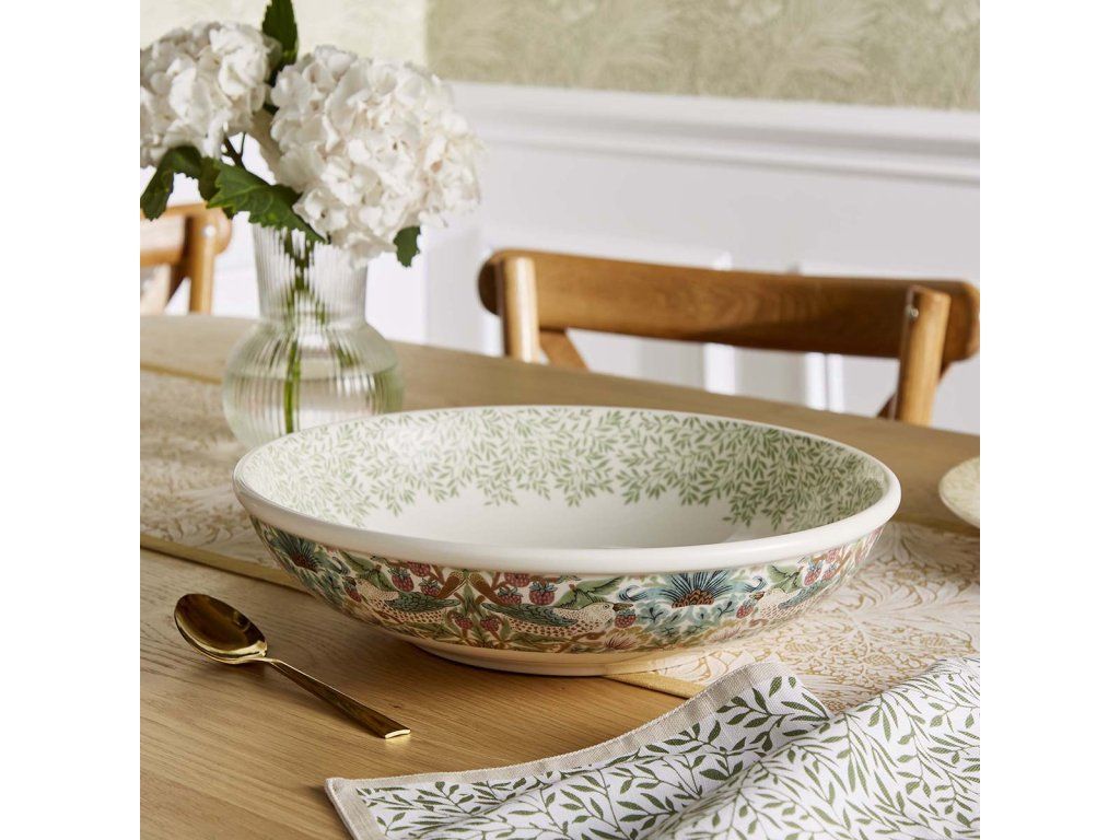 Nabízíme Vám krásnou nízkou širokou servírovací mísu ve stylu Morris & Co. z kolekce Simply Mixed v lístečkovém motivu Standen v kombinaci s motivem drozdů kradoucí jahody Strawberry Thief vhodnou k servírování salátů, pečiva, masa nebo jen jako krásnou dekoraci.