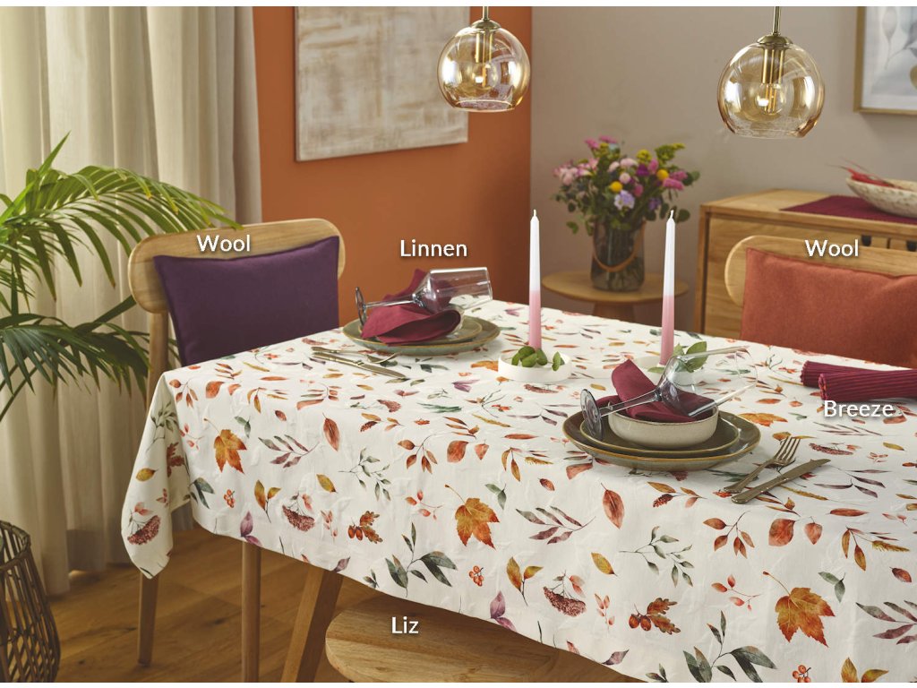 Nabízíme vám krásný textilní ubrus se vzorem podzimního listí ve 3D zpracování od značky Sander. Ubrus rozzáří váš podzimní stůl a bude vám dělat radost v chladných dnech. V této kolekci nabízíme i další produkty: středový pás Sander Liz v rozměru 50x140cm, velký čtverec ubrus 100x100cm Sander Liz, klasický velký ubrus Sander Liz 130x170cm a malý čtverec Sander Liz 85x85cm.