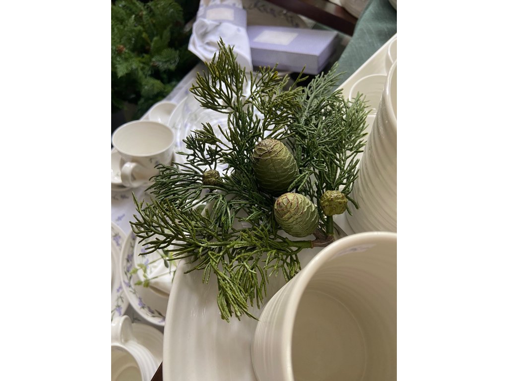 Nabízíme Vám krásnou umělou dekoraci cedrové větvičky se šiškami v zelené barvě, která je vhodná na položení na stůl při svátečním prostření nebo při větším počtu i do vázičky.