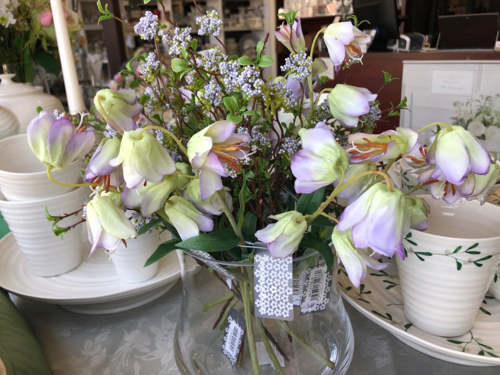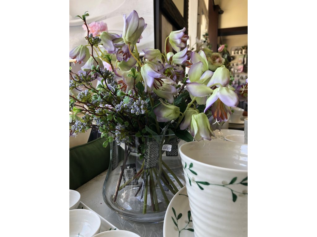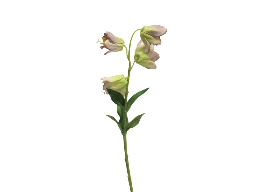 Nabízíme Vám krásné umělé větvičky s květy a listy zvonku Campanula v bílo-zelené barvě s jemným modro-fialovýcm lemováním po obvodu okvětí jako umělou dekoraci do Vašeho interiéru. V případě, že máte nižší vázu je možné délku stonků upravovat zahnutím dle potřeby.