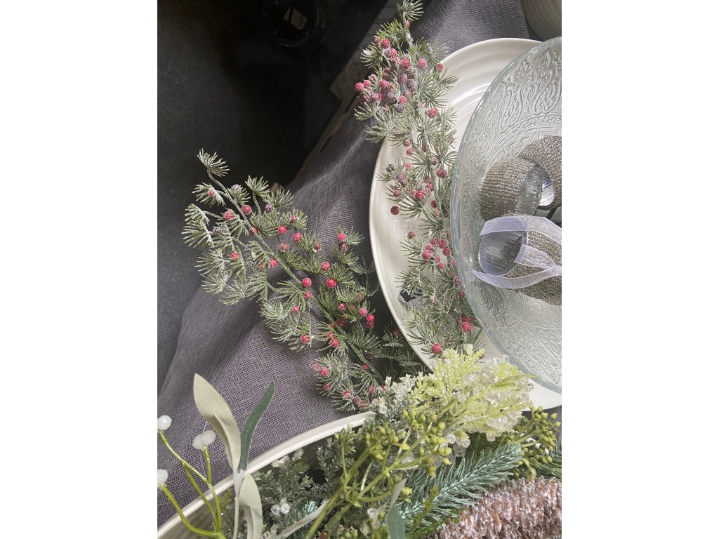 Nabízíme Vám krásnou umělou dekoraci Japonské větve v zelené barvě s červenými kulačkami s efektem zasněžení. Větvička je vhodná jako umělá dekorace do vázy společně s jinými vánočními či podzimními květinami nebo jako dekorace na položení.
