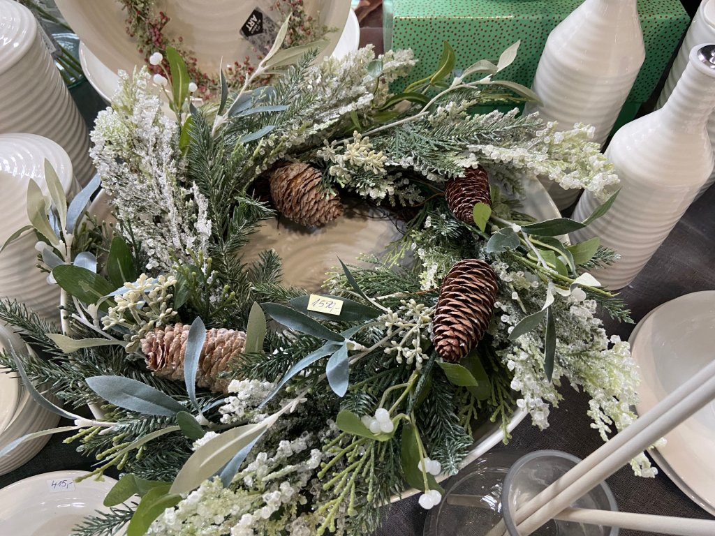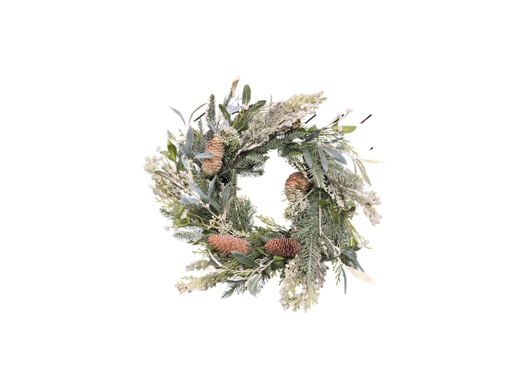 Nabízíme Vám krásný originální zimní či vánoční věnec z jedlových větviček s imitací omrzlých ledových ojínění. Jedlové větvičky jsou dekorovány v kombinaci s jinými větvičkami a šiškami. Je vhodný na zavěšení kolem dveří, na položení do středu sváteční tabule.