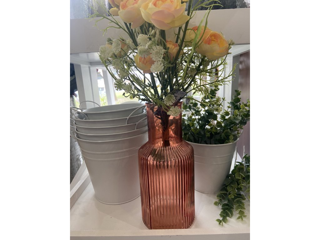 Nabízíme Vám krásnou menší skleněnou vázu lahvovitého tvaru v růžovo-oranžové barvě s vroubkovanou texturou. Jedná se o menší vázičku, kterou pohodlně postavíte na menší stolek, nebo komodur do interiéru i na terasu. Dekorovat můžete řezané nebo dekorativní umělé květiny.