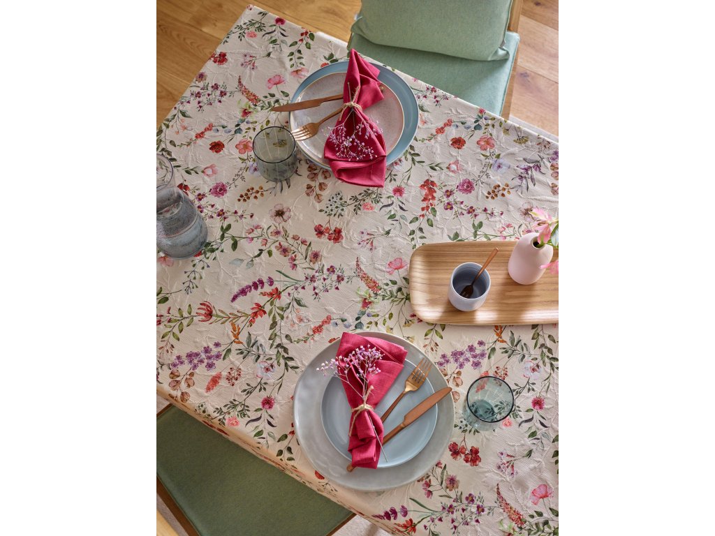 Textilní ubrus velký v klasickém rozměru jídelního stolu Sander Tess s krásným motivem drobných kytiček a větviček. Tento ubrus je originální svým provedením, kde kromě krásného vzoru můžete obdivovat i 3D zpracování vláken. V této kolekci nabízíme i další rozměry, např. středový pás 50x140, kulatý ubrus 170cm, velký čtverec 95x95cm, povlak na polštář 40x40cm a další. Všechny produkty této řady mají vysokou kvalitu a snadno se udržují.