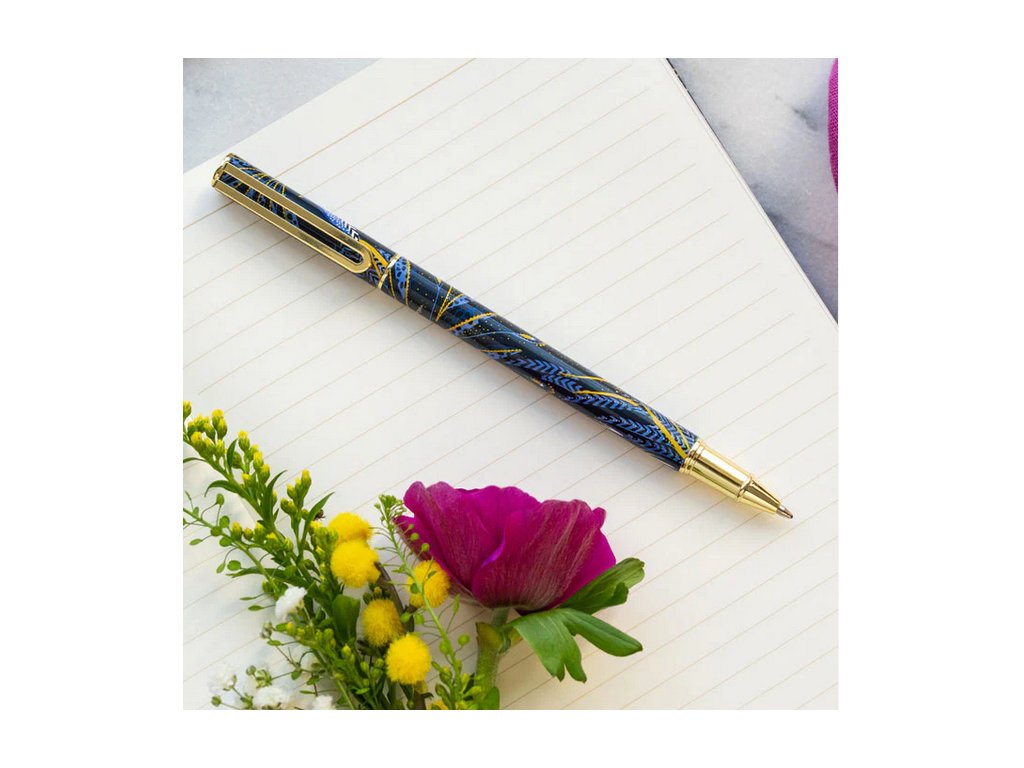 Nabízíme Vám luxusní propisku Peacock Parade, která je pozoruhodným spojením umění a funkčnosti. Rozevlátá paví pera se rozkládají na temně modrém indigovém pozadí, zvýrazněném třpytivými zlatými detaily pro nádech luxusu. Toto prémiové pero, elegantně prezentované ve stylové krabičce, je ideální jako sofistikovaný dárek nebo šik doplněk na váš stůl či do kabelky. Díky bezpečnému zavírání víčka a nadčasovému designu promění každodenní psaní v okamžik elegance a stylu.